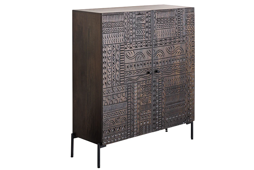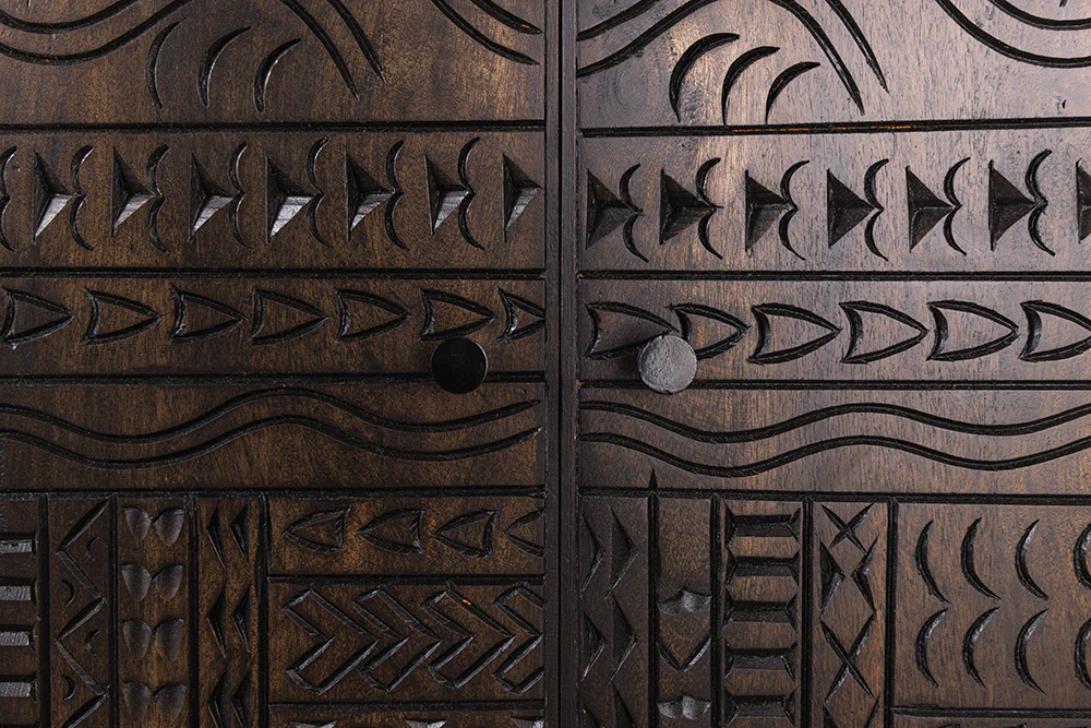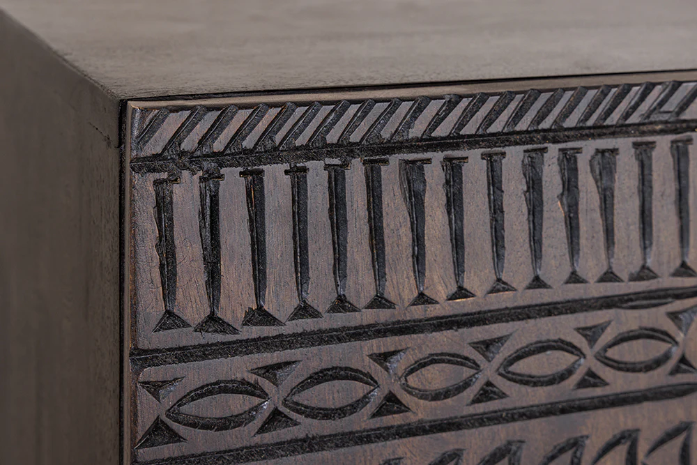 Pristatome indauja TRIBAL, pasižyminčią įspūdingu antikvariniu stiliumi, pagamintą iš sodrios tamsiai rudos mangmedžio medienos ir apdailintą elegantiška juoda lentynėle – tai amžinos elegancijos ir šiuolaikinio meistriškumo įrodymas. Lakuotas paviršius ne tik pabrėžia gilius, šiltus atspalvius, bet ir užtikrina ilgalaikę apsaugą, todėl spintelė idealiai tinka kasdieniam naudojimui.