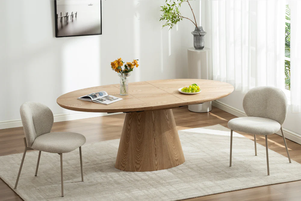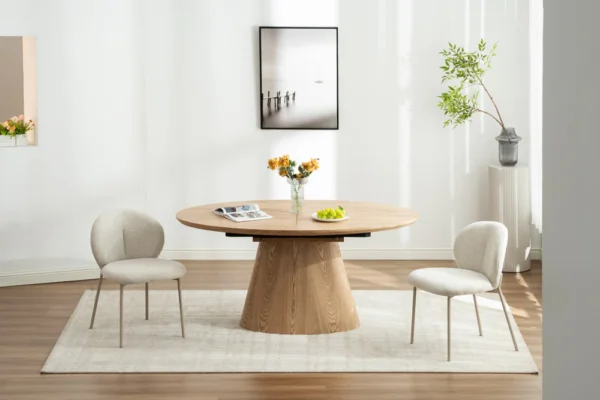 Suteikite savo valgomajam prabangos akcentą su stalu ELEGANZA. Apvalių formų, tvirto dizaino ir ąžuolo lukšto paviršiumi dengtas stalas ne tik atrodo įspūdingai, bet ir yra itin praktiškas – lengvai išskleidžiamas nuo 160 cm iki 200 cm, todėl patogiai sutalpinsite tiek šeimos vakarienę, tiek didesnę svečių kompaniją.