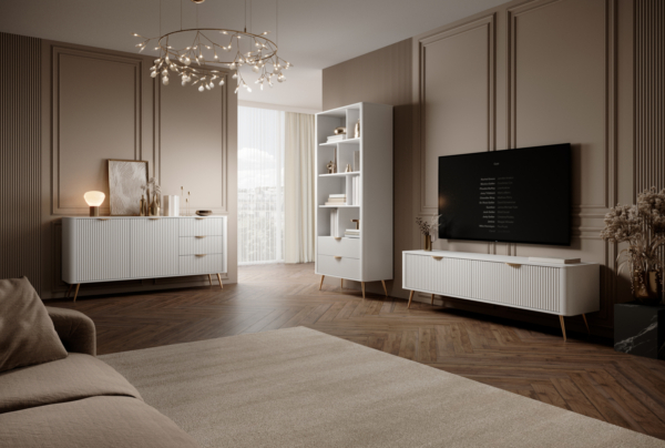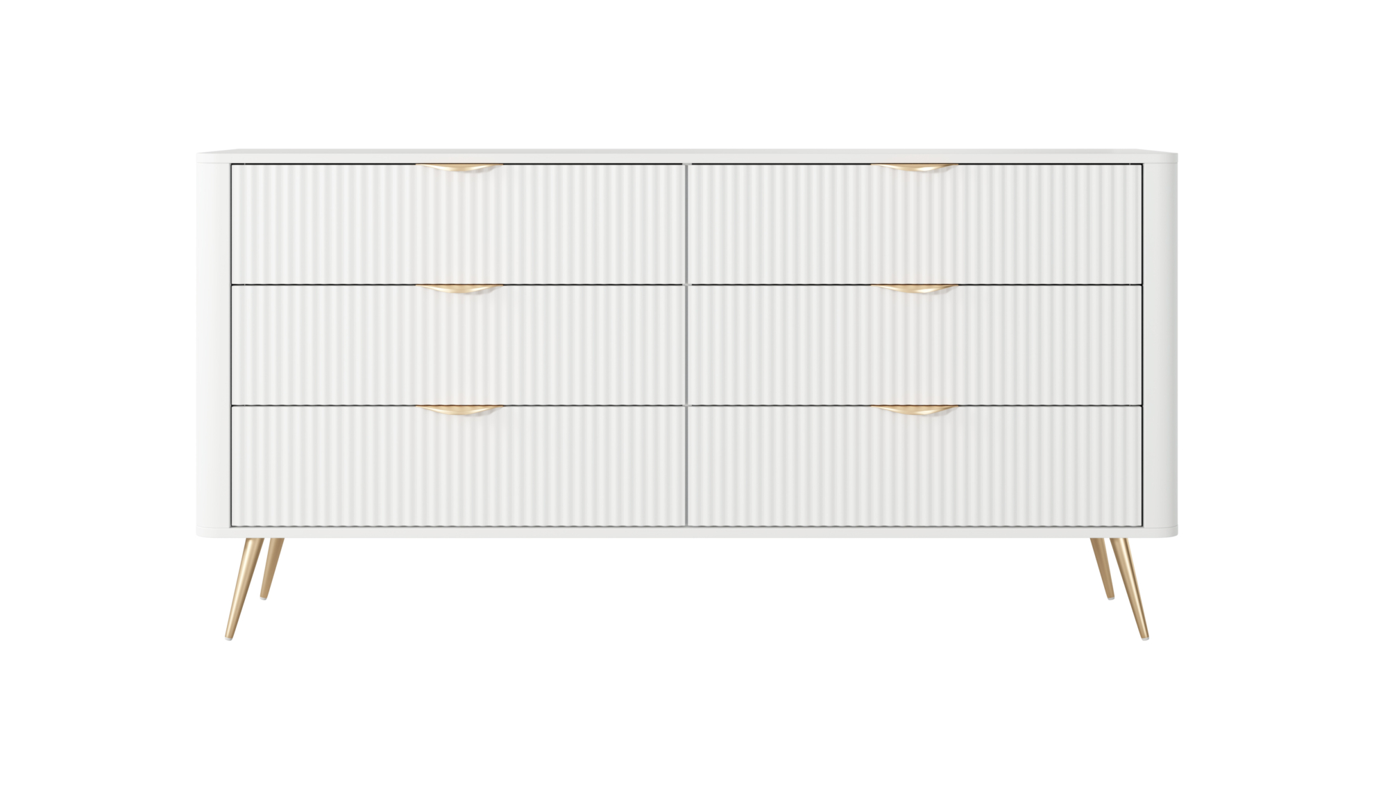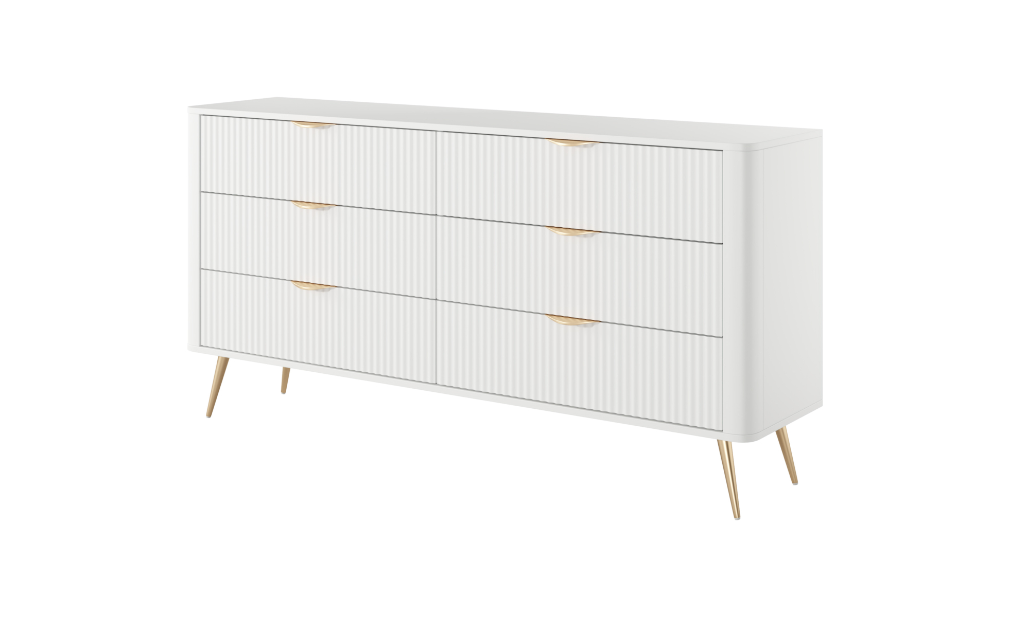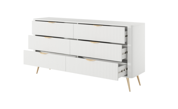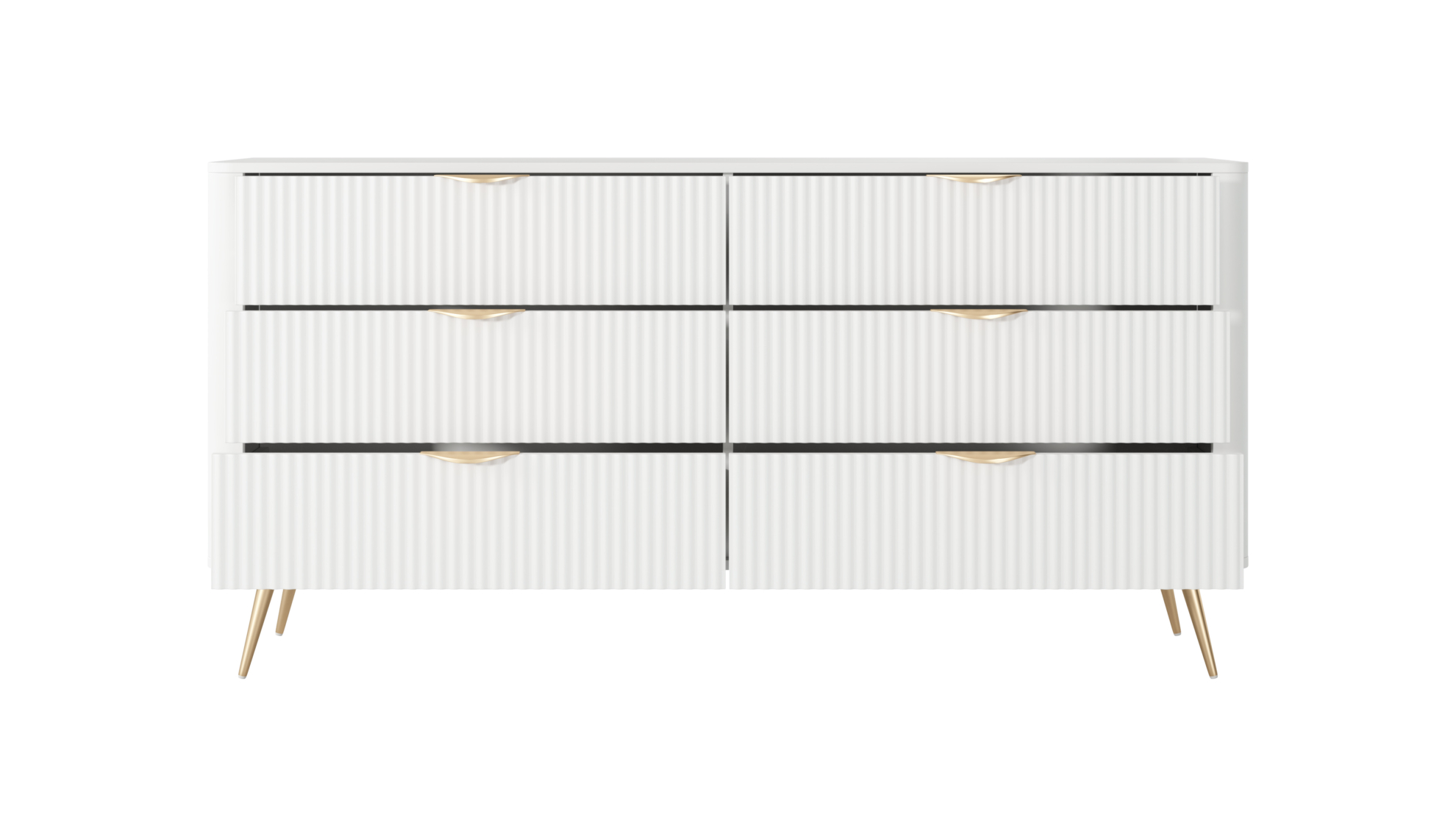 SONTE komoda su šešiais stalčiais – tai praktiškas baldas, kuriame patogiai susidėsite drabužius, dokumentus ar kitus daiktus. Šviesi balta spalva kartu su aukso spalvos akcentais suteikia modernumo ir subtilios prabangos.