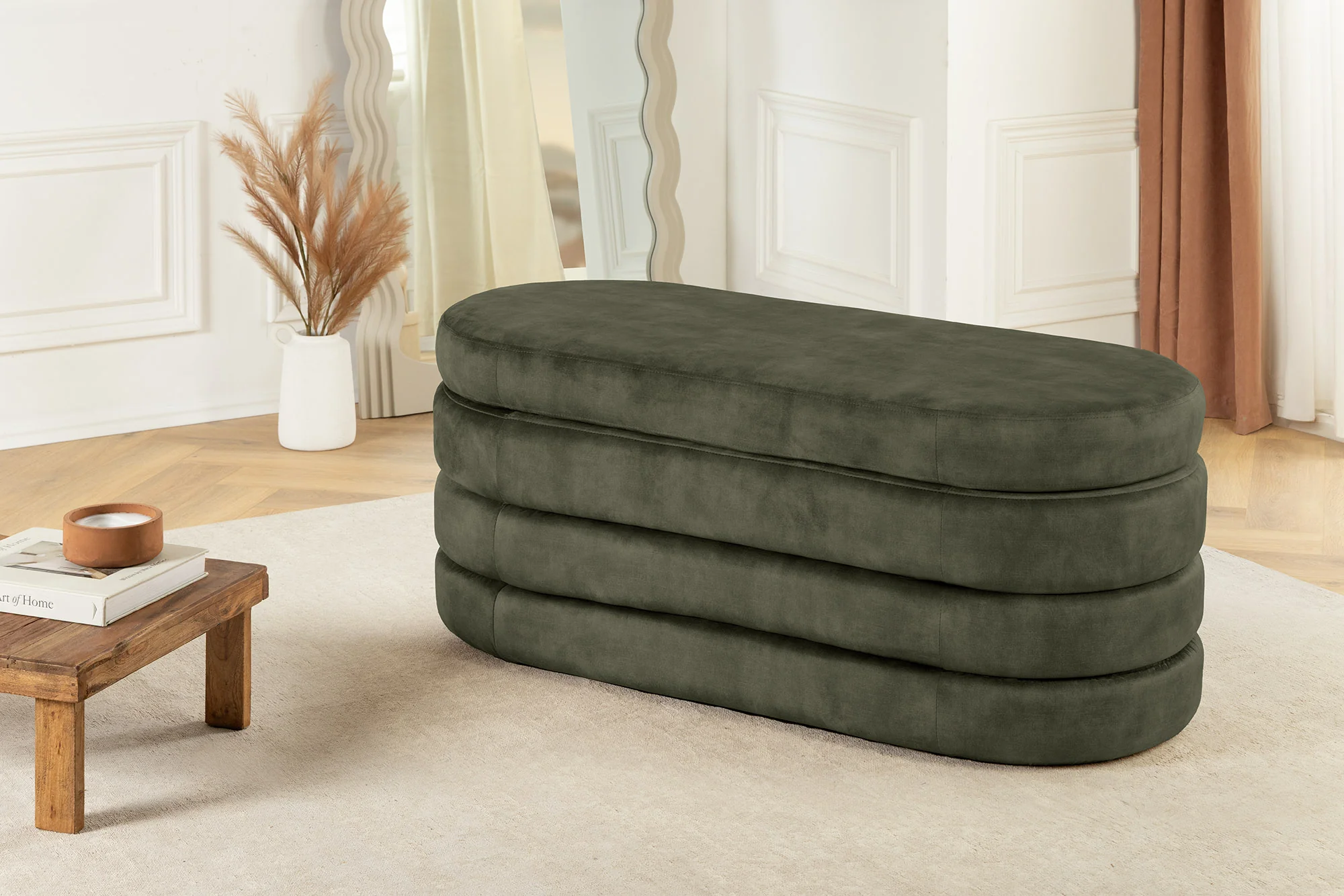 Šviežios žalios spalvos VOQUE aksominis minkštasuolis derina prabangų komfortą ir sumanią paslėptą saugojimo vietą, todėl tai stilingas būdas išvengti netvarkos. Puikiai pritaikytas dydis ir tvirtumas – tai puiki vieta poilsiui ar stilingam tvarkymuisi.