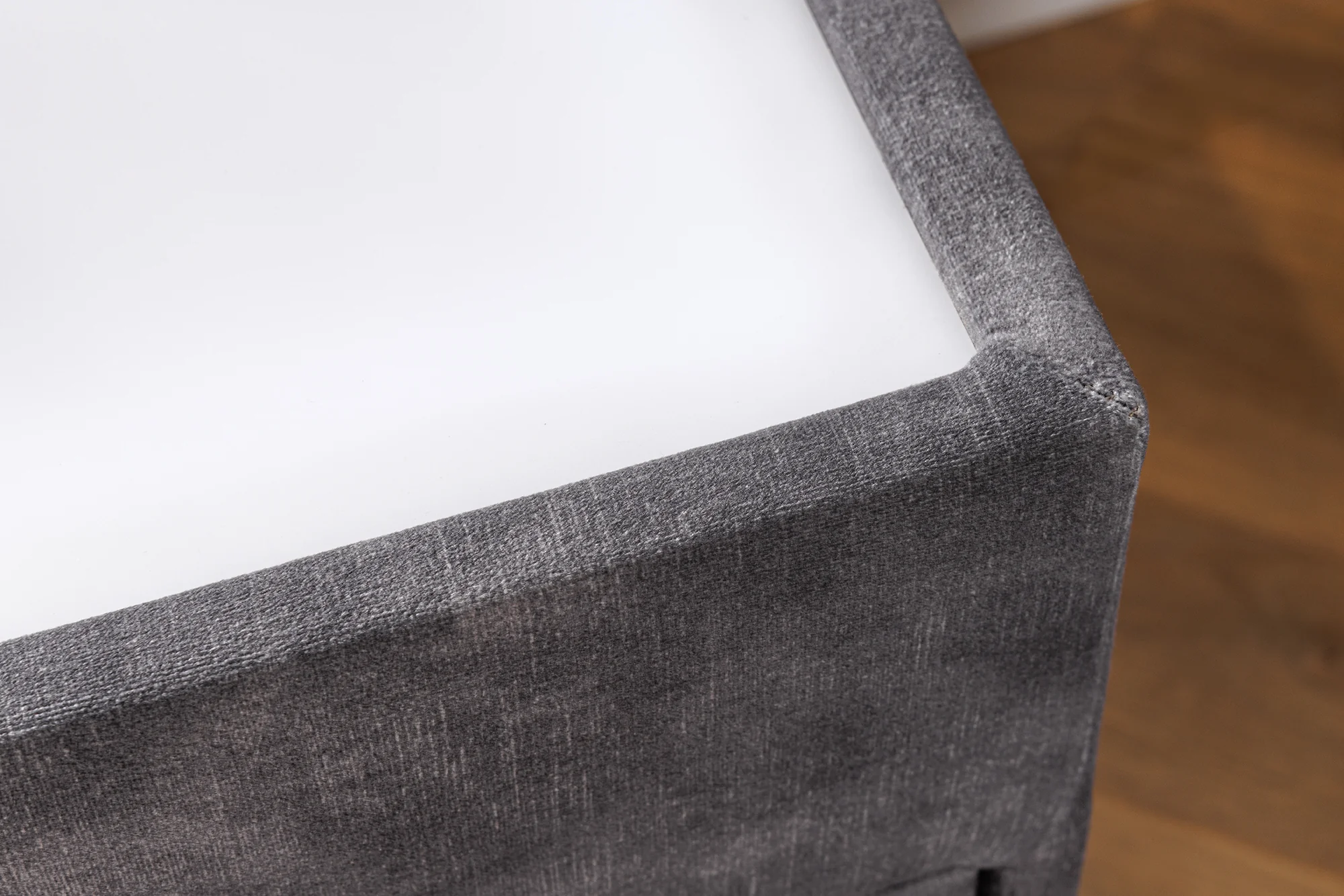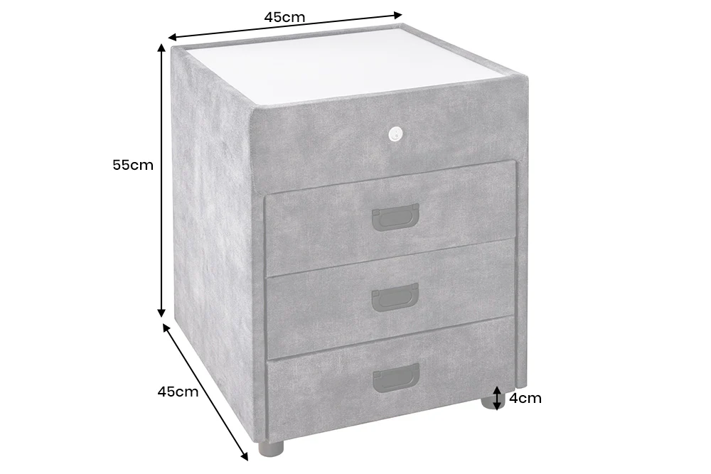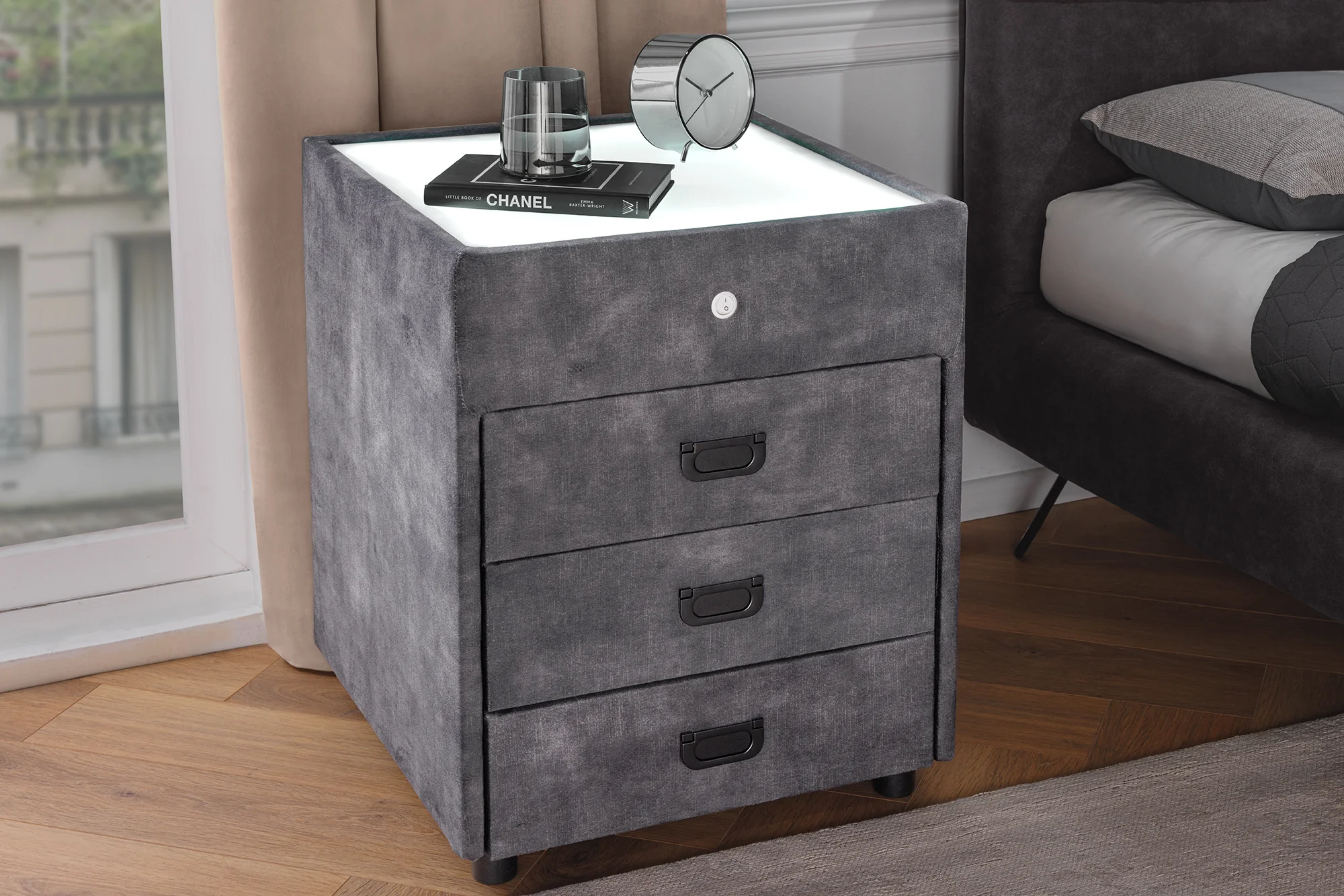 PARIS naktinis staliukas derina modernų dizainą su švelniu pilku aksomu ir įmontuotu LED apšvietimu, kuris suteikia šiltą šviesą jūsų vakarams. Tiesiog keletą kartų paspauskite įjungimo/išjungimo mygtuką, kad pakeistumėte LED spalvą ir sukurtumėte tobulą atmosferą.