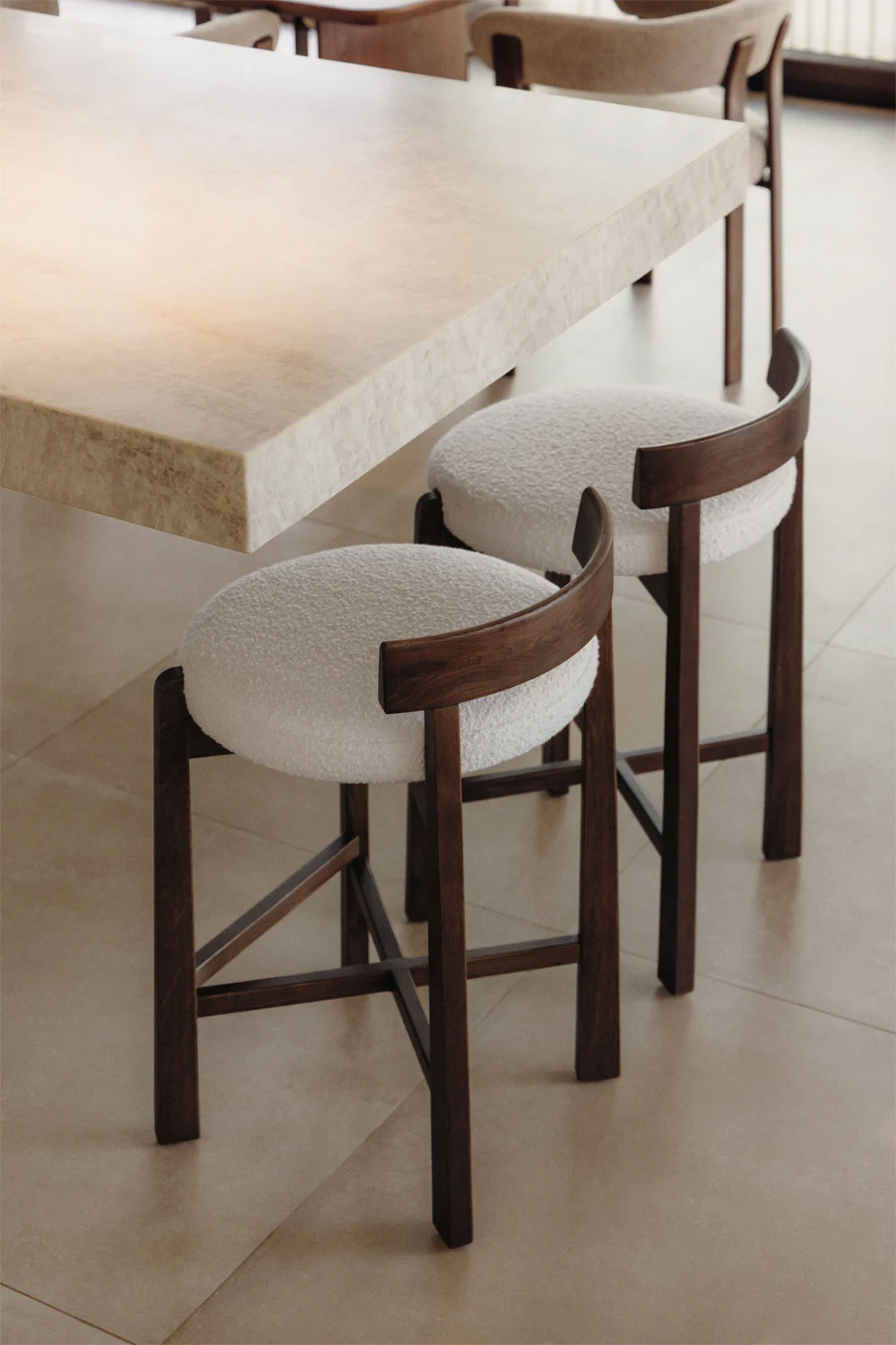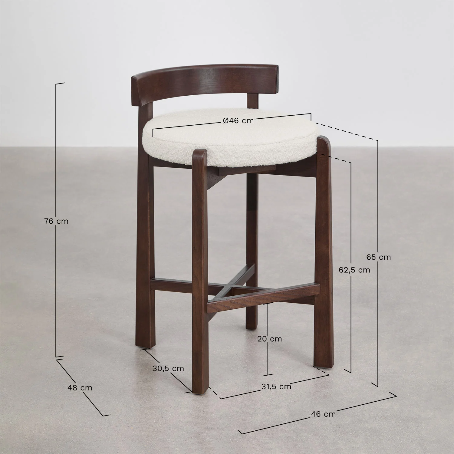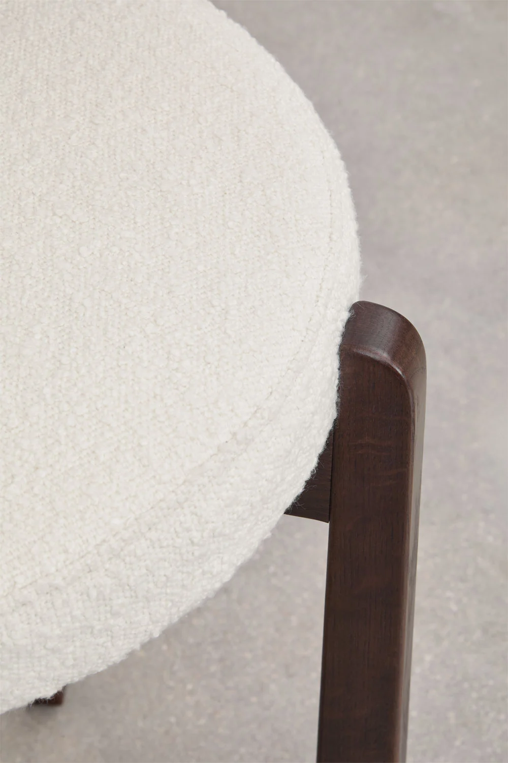 Tvirta konstrukcija užtikrina ilgaamžiškumą ir stabilumą, o kruopščiai apgalvotos proporcijos garantuoja patogų kasdienį naudojimą. Ji aptraukta balto bouclé audinio poliesterio apmušalu, kuris pasižymi išraiškinga tekstūra, švara ir laikui nepavaldžiu, prabangiu charakteriu.