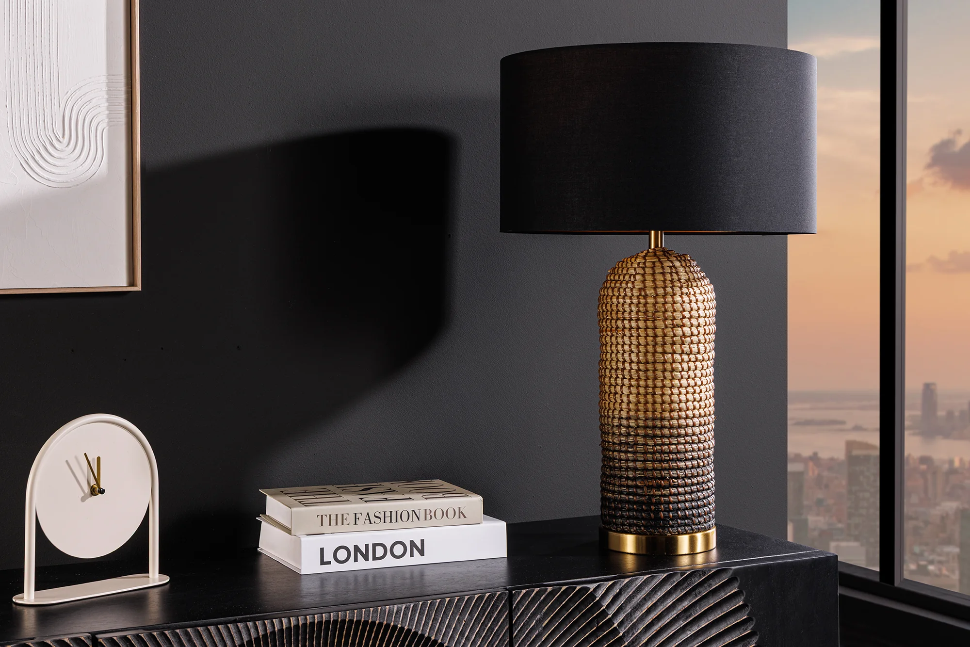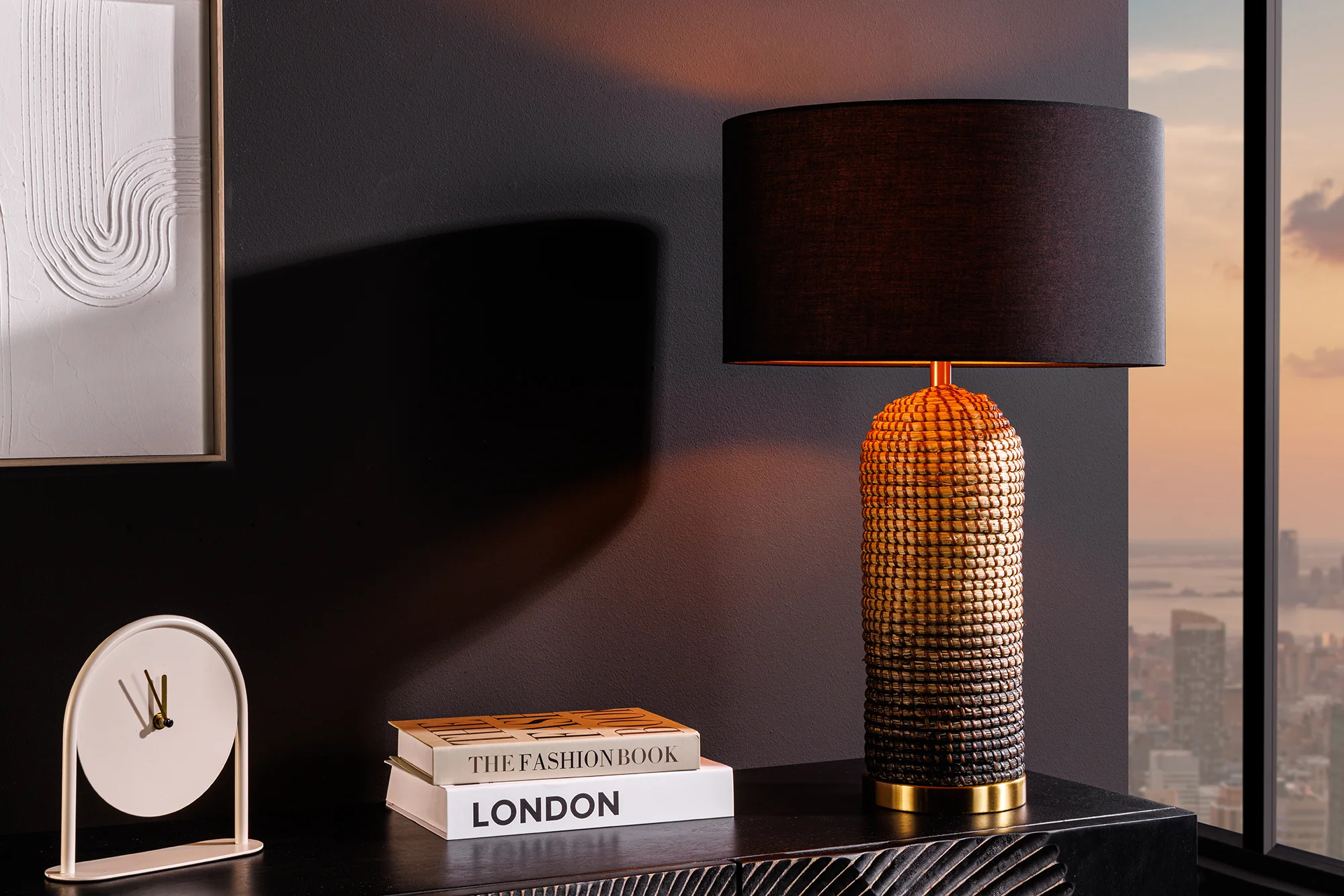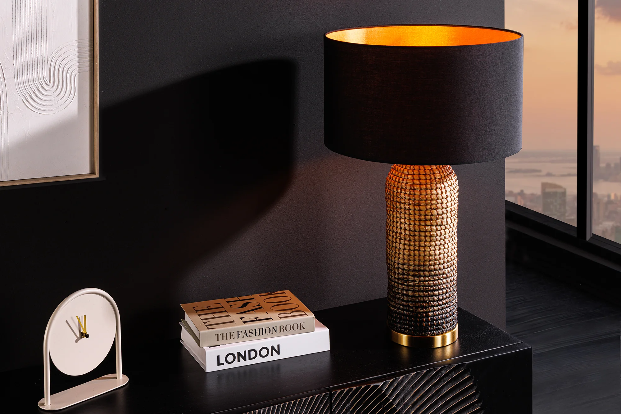 Pagyvinkite savo gyvenamąją erdvę žavinga stalo lempa ZEA, pagaminta su tikru meistriškumu! Ši grožybė pasižymi įspūdingu natūralaus rudo ir aukso spalvos stovu, kuris puikiai dera prie jaukių kampelių arba tampa akcentu ant jūsų šoninio staliuko.