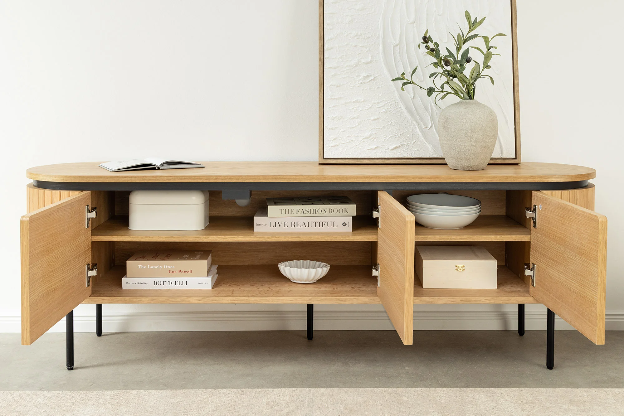 ATELIER TV staliukas derina elegantišką ąžuolo fanerą su ryškiai juodomis metalinėmis kojomis, todėl tampa puikiu akcentu bet kurioje gyvenamojoje erdvėje. Dėl sumaniai suprojektuotos saugojimo sistemos ir tvirtos konstrukcijos jūsų pramogų reikmenys bus tvarkingai sudėti ir stilingai išdėstyti.