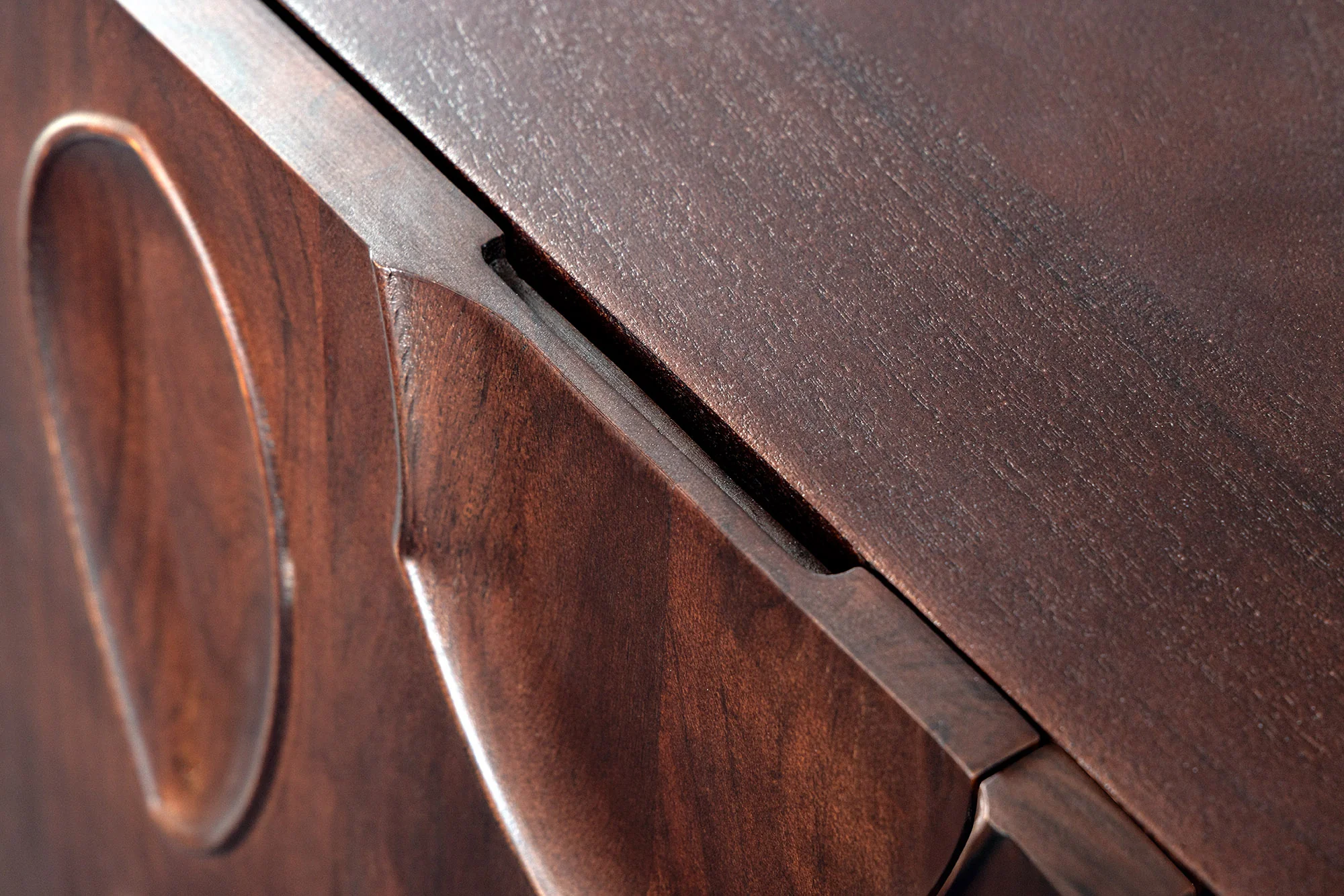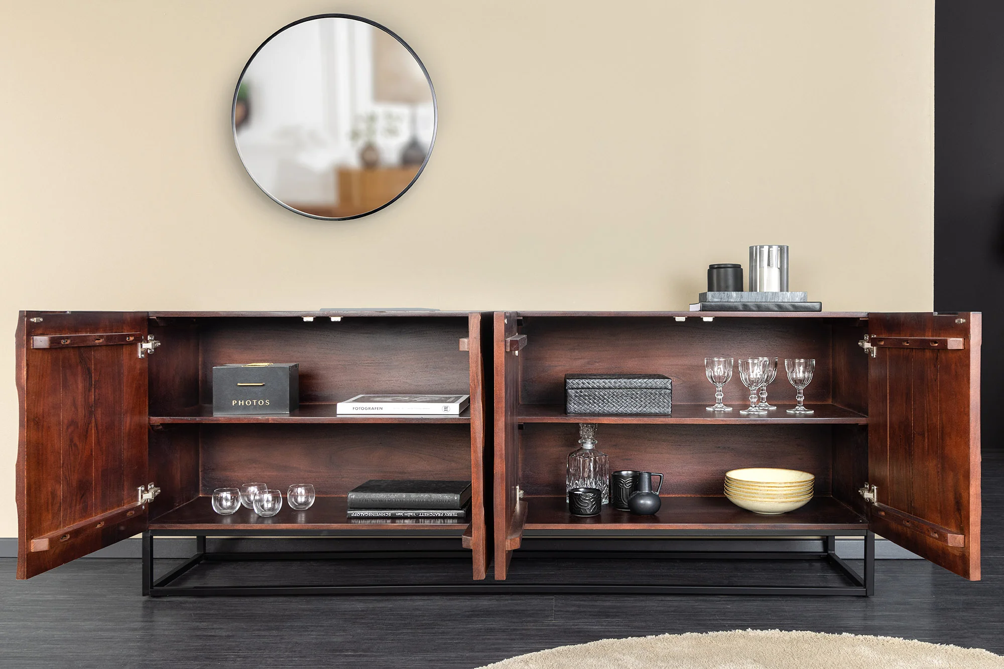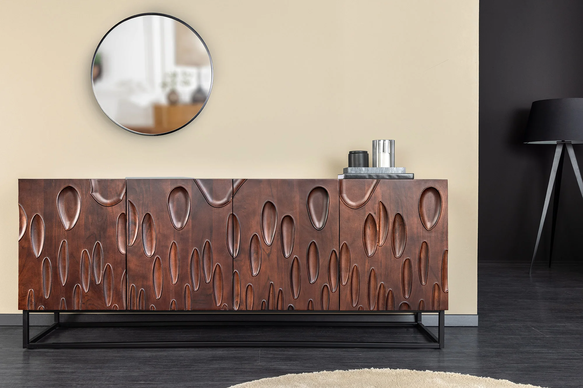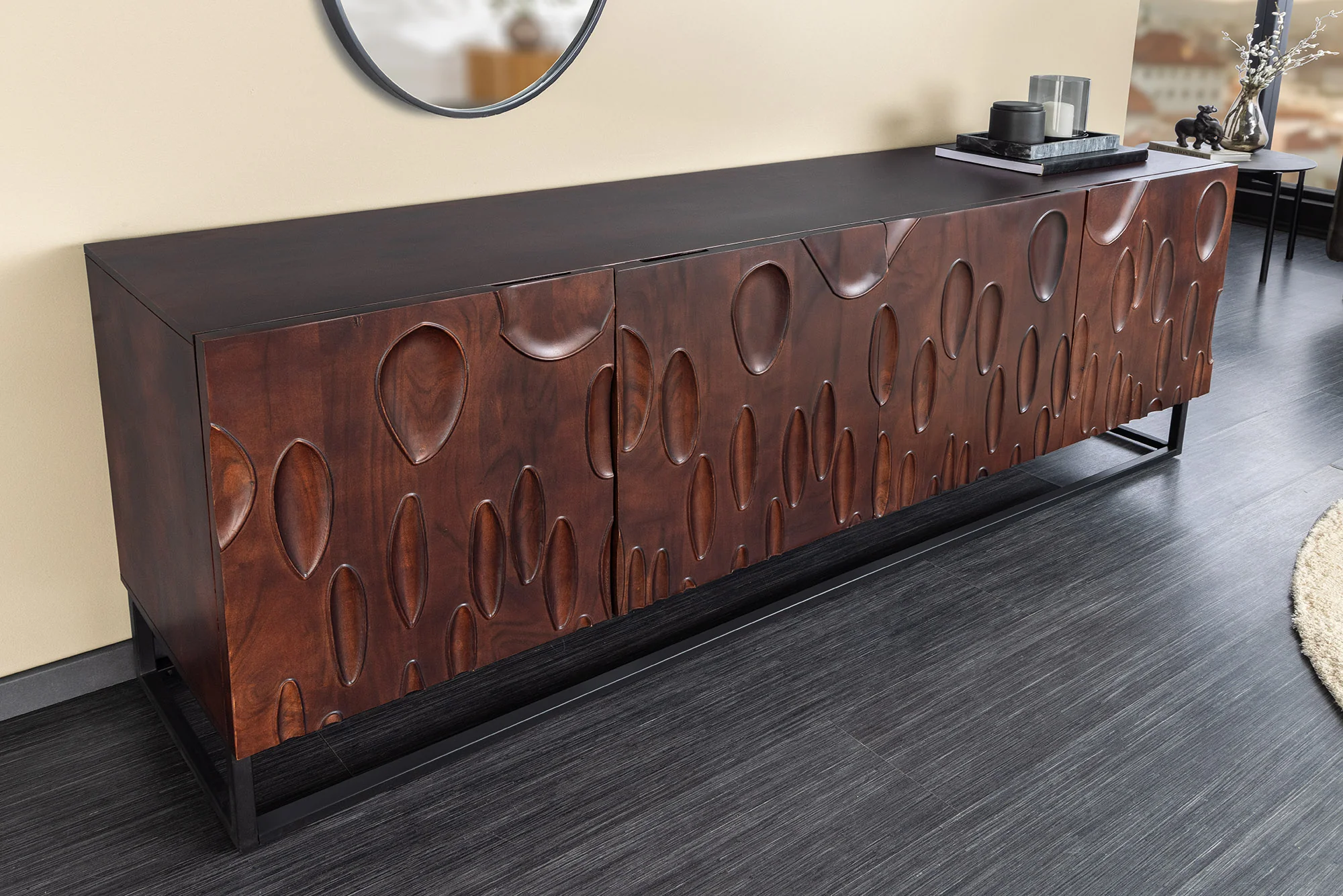 „DUNE” komoda derina tamsaus riešuto medžio žavesį su elegantiškais juodais akcentais, todėl tai stilingas baldas daiktams laikyti, kuris puikiai tinka bet kurioje patalpoje. Dėl daugybės paslėptų lentynų ir tvirtos akacijos medžio konstrukcijos jis yra tiek praktiškas, tiek patrauklus.