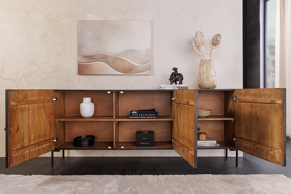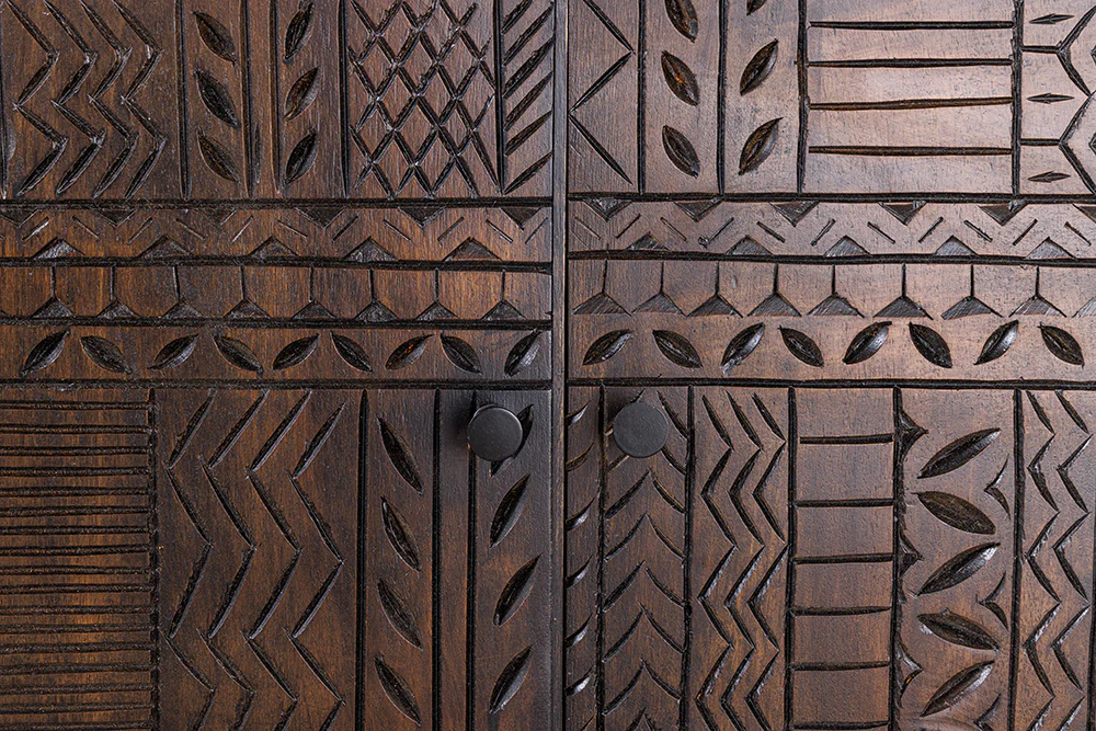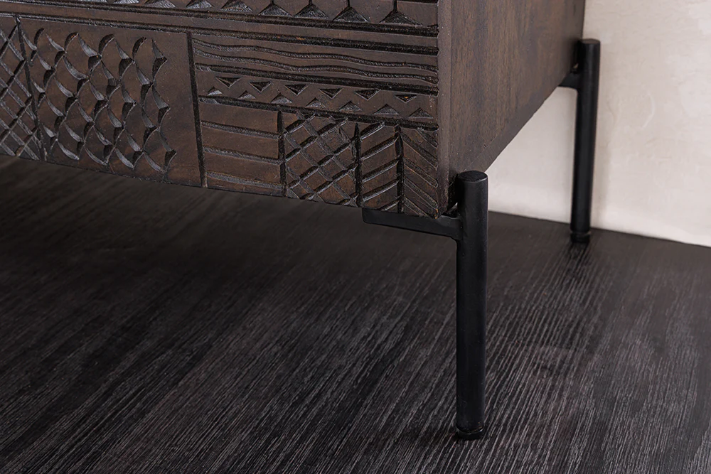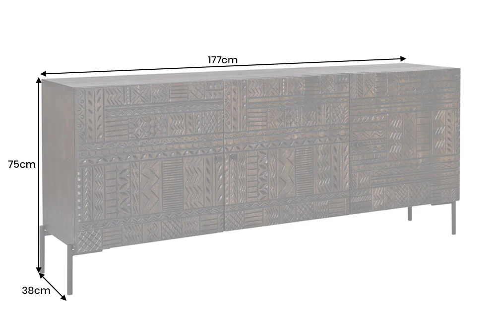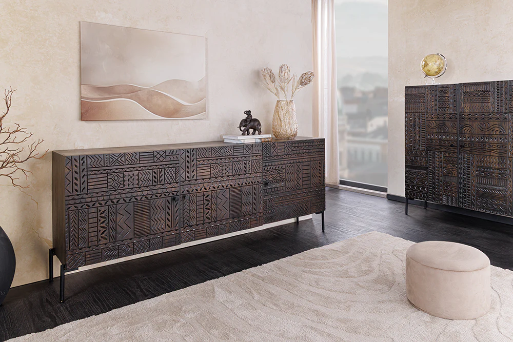 Sveikinkite komodą TRIBAL – jūsų naują mėgstamą baldą, kuris suteiks jūsų erdvei individualumo. Pagamintas iš sodrios, tamsiai rudos mangmedžio medienos su įspūdingu juodu stelažu, šis bufetas spinduliuoja charakterį ir šilumą.